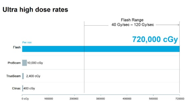 在2018年10月北美放射腫瘤學(xué)會(huì)年會(huì)上,瓦里安宣布了具有“諾貝爾獎(jiǎng)”意義的超高劑量極速癌癥治療方法——“Flash”。這將是革命性的最新粒子治療方法。Flash 療法是一種非侵入性治療,以極高的劑量及劑量率(72萬(wàn)cGy/分鐘)在極短的時(shí)間里(1秒內(nèi))對(duì)人體癌癥部位釋放質(zhì)子束流。在一次照射后,癌癥細(xì)胞能就被摧毀而正常細(xì)胞損害顯著降低。目前已經(jīng)基本完成動(dòng)物試驗(yàn),不久將進(jìn)入臨床試驗(yàn)階段。