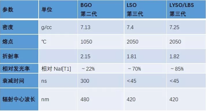(1)晶體:從理論上講,表1所列幾種晶體均可以用于PET探測器,但是從臨床經(jīng)驗(yàn)來看,目前用于PET探測器的晶體主要有BGO、LYSO、LSO和LBS等四種。其中LYSO、LSO以及LBS這類晶體由于含有金屬镥(Lutetium),因此余輝時間明顯減少。一般認(rèn)為晶體余輝時間小于80ns(納秒)就可以實(shí)現(xiàn)飛行時間(Time of Flight, TOF)技術(shù)。而BGO等晶體余輝時間太長,不能實(shí)現(xiàn)TOF技術(shù),即將淘汰(1,2)。當(dāng)然,含镥晶體(LSO、LYSO)也有其不足,就是含有自身本底放射性,有效原子序數(shù)偏小,會導(dǎo)致射線探測效率降低。所以,一般講LYSO、LSO和LBS這類晶體在PET探測器中其最佳長度為20mm左右(3)。所以,如果選擇LYSO、LSO或LBS這一類晶體,那么就必須具有TOF技術(shù)來彌補(bǔ)或克服其探測效率低的固有缺陷。