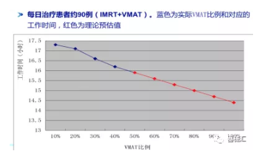 需要說明的是,有些技術(shù)本身并不是為了加快治療速度而發(fā)展起來的,例如,大分割放療技術(shù),其發(fā)展的本質(zhì)是基于其生物效應(yīng)優(yōu)勢。但是我們不能否認,該技術(shù)的發(fā)展確實減少了定擺位的累計次數(shù)和時間,等于是減少了整個的治療時間,有利于在同樣多的時間里可以治療更多的患者。同樣,多采用VMAT技術(shù),和普通IMRT相比,也能減少工作時間。如下圖所示: