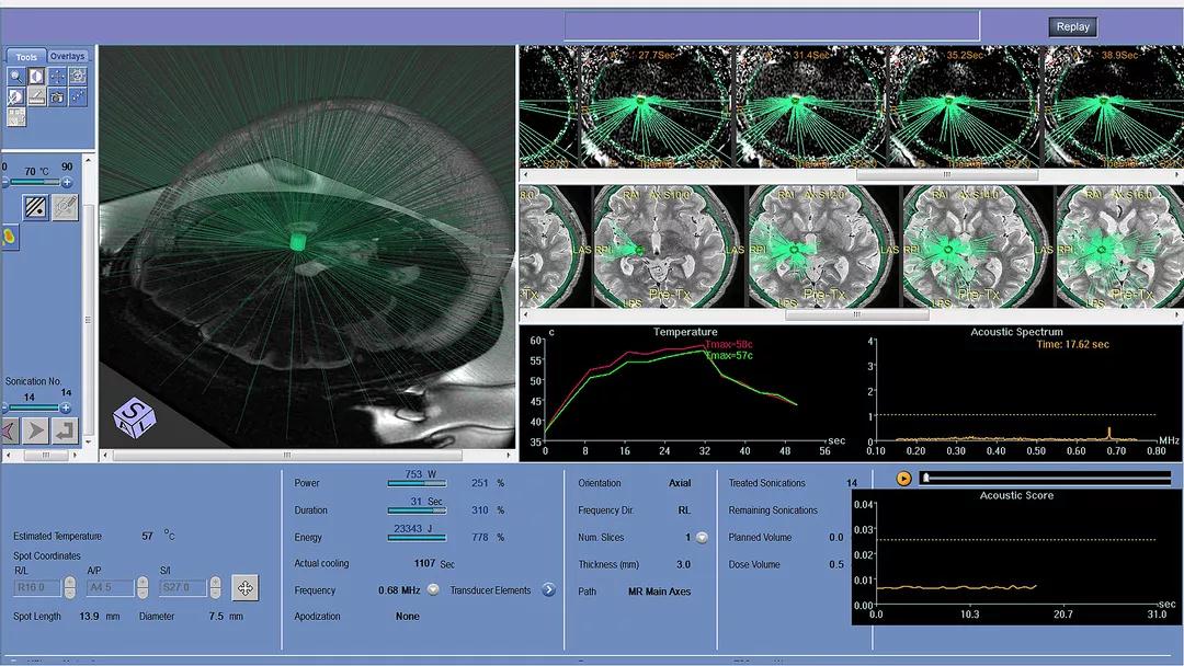 Exablate Neuro 用于對藥物難治性突發(fā)性震顫患者進(jìn)行單側(cè)丘腦切開術(shù)治療。其超聲波可安全穿過腦顱,聚合后將震顫致病靶點(即丘腦的 VIM 核)加熱融化。