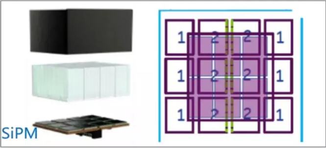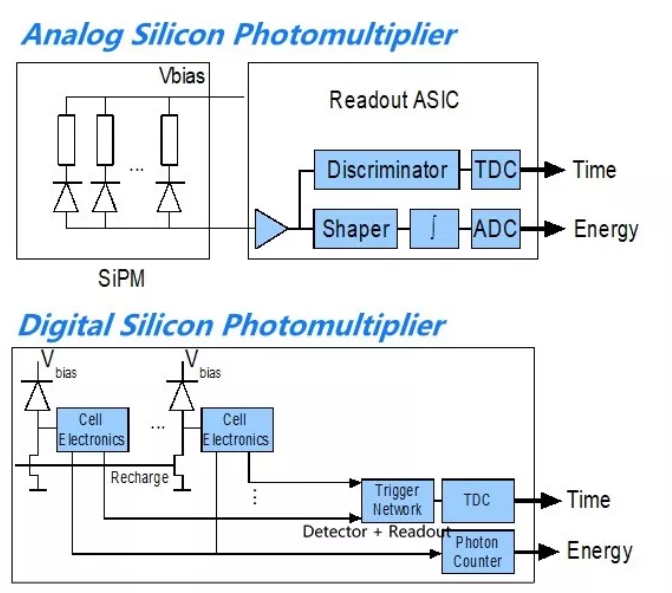 SiPM較傳統(tǒng)的PMT而言,采用了半導(dǎo)體集成電路芯片技術(shù)。這種半數(shù)字化芯片產(chǎn)品,體積明顯減小,可以做到高度的集成化,同時可以實(shí)現(xiàn)PET中關(guān)鍵的TOF技術(shù)。但是,模擬信號到數(shù)字信號的A/D轉(zhuǎn)換依然需要后續(xù)ASIC電路來解決,SiPM只是和原來的PMT一樣,單純的進(jìn)行信號的接受放大,其采集到的電信號通過后續(xù)的電路去估算大致的光子計(jì)數(shù),并轉(zhuǎn)化成數(shù)字信號,一個輸出=所有脈沖的疊加,處理過程依然受到模擬電路的影響(3,7)。