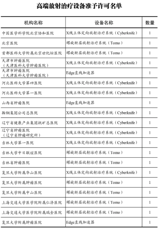 近日,國家衛(wèi)生健康委員會(衛(wèi)健委)發(fā)布了《關(guān)于2019年甲類大型醫(yī)用設(shè)備配置許可的通告》(以下統(tǒng)稱“通告”),通告中公布了已取得質(zhì)子放射治療系統(tǒng)、正電子發(fā)射型磁共振成像系統(tǒng)(PET/MR)、高端放射治療設(shè)備(包括X線立體定向放射治療系統(tǒng)(英文簡稱Cyberknife)、螺旋斷層放射治療系統(tǒng)(英文簡稱Tomo)HD和HDA兩個型號、Edge和Versa)配置許可證的醫(yī)院名單。