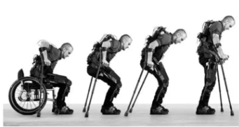 2010年,伯克利仿生研究所研制出的一種由電池提供動力的機(jī)械骨骼系統(tǒng)“eLEGS“。這是世界上第一款不使用繩或鏈達(dá)到自然行走目標(biāo)的外骨骼,使用者通過手臂姿勢控制,向前移動右拐杖,則左腿隨之向前移動,幫助截癱患者擺脫輪椅以自然步態(tài)行走。