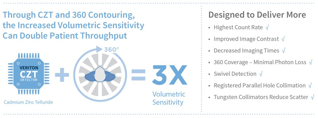 Spectrum Dynamics Veriton SPECT-CT 憑借360度探測(cè)器覆蓋范圍和獨(dú)特的接近傳感器,與當(dāng)前技術(shù)相比,其體積靈敏度提高了3倍。