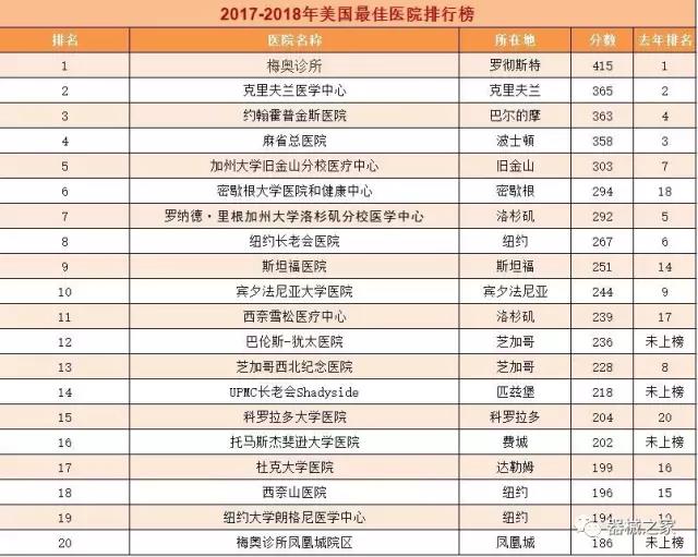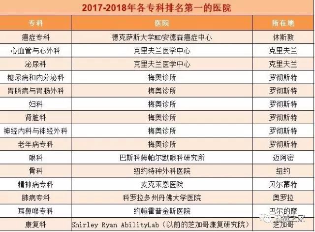 在醫(yī)療界梅奧診所就是傳說中的麥加,世界頂尖的醫(yī)療機(jī)構(gòu)。2017年8月8日,《美國新聞與世界報(bào)道》公布了2017-2018美國最佳醫(yī)院排行榜,梅奧診所以415分的總分再次榮登榜首,并在糖尿病和內(nèi)分泌??啤⑽改c科、婦科、腎臟科、神經(jīng)??坪屠夏瓴W(xué)六個(gè)??浦信琶谝?。