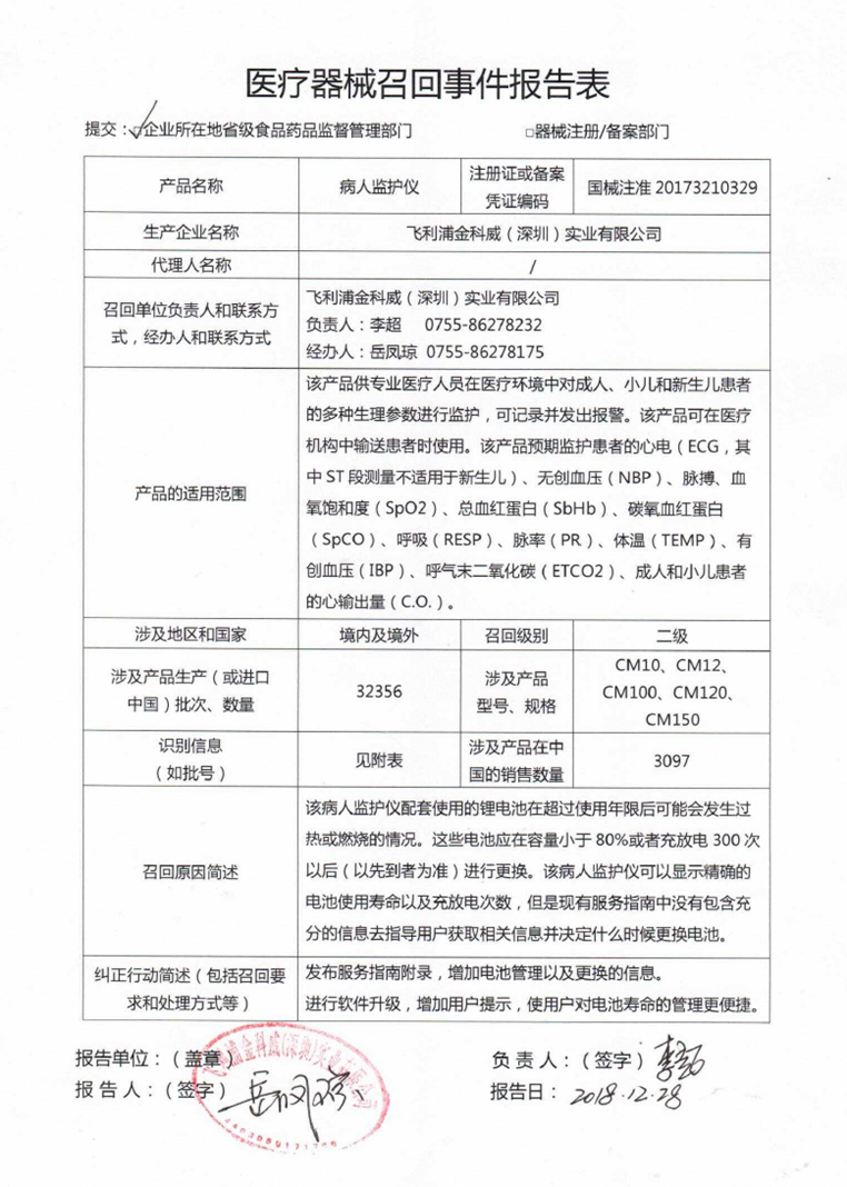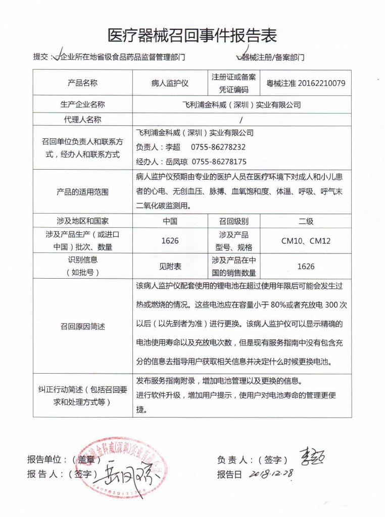 2018年,飛利浦也曾發(fā)布了多起對病人監(jiān)護(hù)儀的召回,其中一份召回報告也是二級召回,涉及到2672臺監(jiān)護(hù)儀,同樣是通過監(jiān)控內(nèi)部產(chǎn)品投訴發(fā)現(xiàn),存在鋰離子電池超過預(yù)期使用壽命后發(fā)熱或燃燒風(fēng)險。