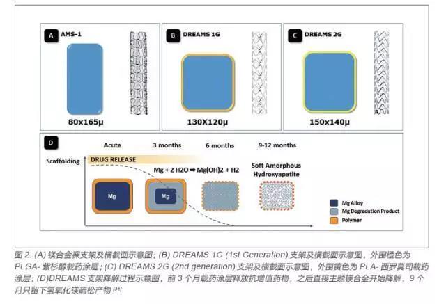 鎂是人體的必需元素,具有多種生理功能,與生命的維持、身體的健康有著極其密切的關(guān)系,因此可降解冠脈鎂合金支架研發(fā)處于可降解金屬支架的領(lǐng)先水平,以德國Biotronik 公司的鎂合金支架為代表, 前后經(jīng)歷了AMS、DREAMS 1G(drug-eluting absorbable metal scaffold 1 generation)和DREAMS 2G(drug-eluting absorbable metalscaffold 2 generation)三代支架(圖2),支架基體采用WE43 鎂合金材料[21]。AMS 為鎂合金裸支架,經(jīng)過PROGRESS 臨床實(shí)驗(yàn)顯示支架具有良好的安全性,且在新生兒體內(nèi)植入兩個(gè)AMS支架后,新生兒血清鎂含量處于正常水平,且不需要進(jìn)行二次手術(shù),但是降解速度太快徑向支撐力不足導(dǎo)致晚期管腔丟失現(xiàn)象嚴(yán)重,因此在該基礎(chǔ)上對鎂合金裸支架的成分和構(gòu)型進(jìn)行了更新,加粗了骨架尺寸,添加了一層載有紫杉醇藥物的可降解PLGA 高分子涂層,從而增強(qiáng)了支架支撐力,減少內(nèi)膜增生以及降低降解速率,研發(fā)出了DREAMS 1G[22-24]。