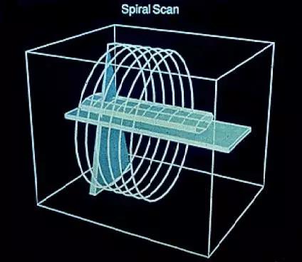 在治療之前,先由KVCT對(duì)病人進(jìn)行斷層掃描,根據(jù)此掃描圖像由治療計(jì)劃系統(tǒng)進(jìn)行逆向治療計(jì)劃設(shè)計(jì),即各個(gè)角度束流形狀及流強(qiáng)分布設(shè)計(jì);也既計(jì)算出在治療環(huán)每一個(gè)旋轉(zhuǎn)角度和治療床前進(jìn)的每一個(gè)位置上的多葉準(zhǔn)直器各個(gè)葉片的確切位置。然后打開加速器,用MVCT再核準(zhǔn)病灶位置;如有錯(cuò)位,預(yù)先進(jìn)行調(diào)節(jié);在治療過程中,治療環(huán)旋轉(zhuǎn)和治療床勻速前進(jìn),進(jìn)行螺旋照射,見圖(2)