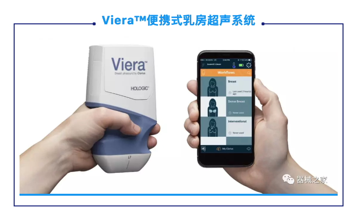 POCUS進(jìn)入乳房成像的另一個例子是2018年Hologic新推出的Viera?便攜式乳房超聲系統(tǒng)。無線超聲掃描儀為醫(yī)生提供了早期診斷和優(yōu)化臨床工作流程的機會。它可以指導(dǎo)介入程序,如活組織檢查,標(biāo)記放置和電線本地化。它還可以將乳房圖像傳輸?shù)街悄茉O(shè)備或PACS。